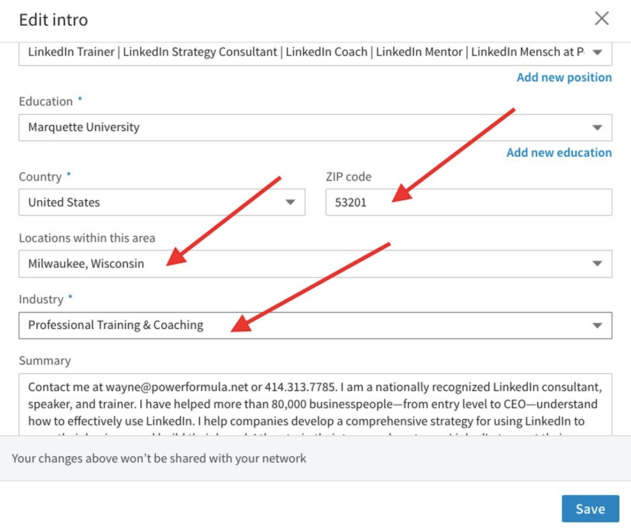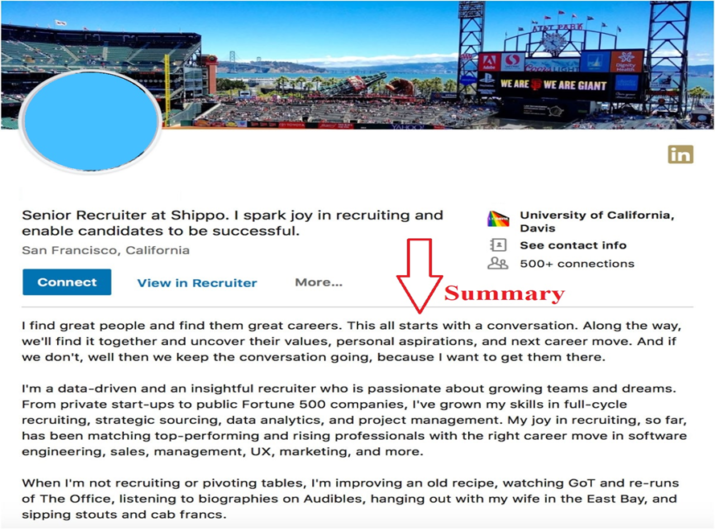 Immediately below your picture, name, location, company and school you have the opportunity to write a summary about yourself. This is a great opportunity to communicate your brand, as well as, use several of your key words. As a starting point I recommend to my clients that they cut and paste the profile statement from their resume.