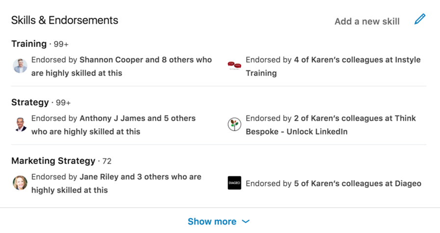 You can list up to 50 skills on LinkedIn and I strongly recommend you strive to list 40-50. Simply put, the more skills you list the better your chances for coming up as a top match for different roles. The easiest place to start is with your keywords. Many of them should describe critical skills you can perform. It is important to consider all the ways that different companies describe your skills, for example if one company calls one of your skills “sales” and other calls it “business development”, then list both. You never know what search terms a recruiter is going to favour so cover all your bases.