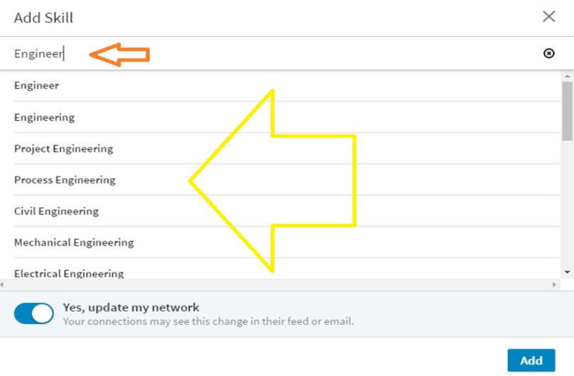 To add, delete, move or in general manage your skills section click on the “Add a new skill” link in the top right-hand corner of the Skill section as shown by the yellow arrow above. Deleting a skill is as simple as clicking on the blue crayon like symbol to the right of “Add a new skill”. You can delete a skill by clicking on the X to the left of it as per the orange arrow below. You can also change the order of your skills by clicking on the 4 horizontal lines as per the yellow arrow below and then moving the skill up or down as desired.