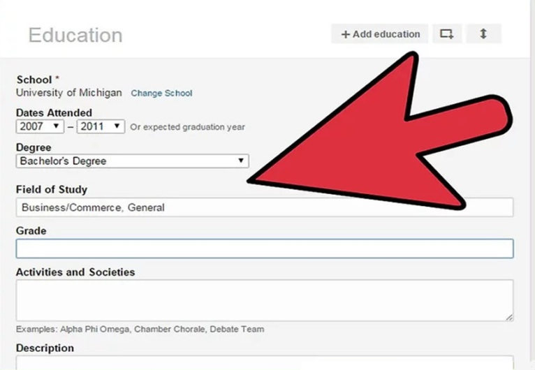 1. As you start to write out your school’s name look at the drop-down menu and click on your university to get the logo besides the name. Logos add visual appeal and credibility. This tip applies equally to your Experience section assuming your current or past company has a company page on LinkedIn.
