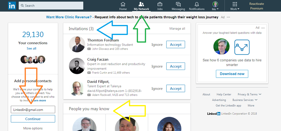 You can accept invitations from people asking to connect with you, see blue arrow below. When it comes to building your network there are two philosophies, conservative and liberal (and this has nothing to do with political preferences).