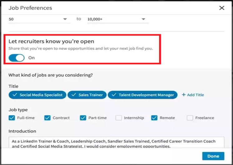· Step 9: Turn ON “Let recruiters know you’re open”